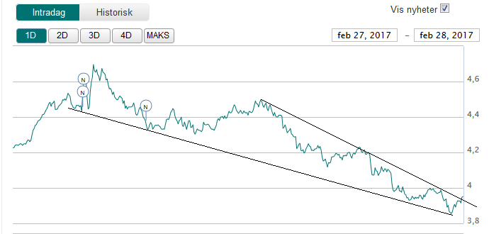 Som de andre sier, sålenge 3,8 holder. Det er jo også etablert mer eller mindre en trippel bunn mellom nivåene 3,8-4,6, så det kan gi en indikasjon på hvor vi skal hvis 3,8 holder.