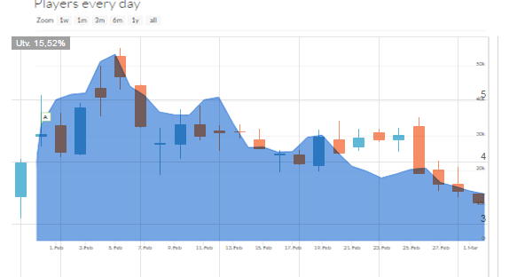 Selv på det nivået er jeg ikke helt trygg. Ikke fult så optimistisk til det fundamentale grunnet CE utvikling som jeg ser mange her inne er. Vil helst se en stødig økning på Players Online samt en ok salgsutvikling. Derav har jeg enda ikke avgjort hverken antall eller horisont.