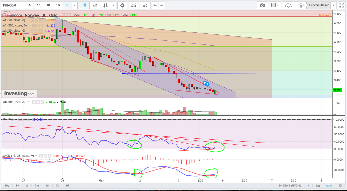 Kan ikke si det ser noe særlig bra ut teknisk og jeg tror vi er enda lite stykke unna bunn - rent teknisk. Likevel nærmer RSI seg oversolgt så vi burde få en reaksjon opp ila. neste uke for å teste 50-dagers glidende snitt på rundt 3.40. Etablerer vi over er det test av 20 dagers som nå er på 4.00 kr og sikkert vil være litt lavere om noen dager.