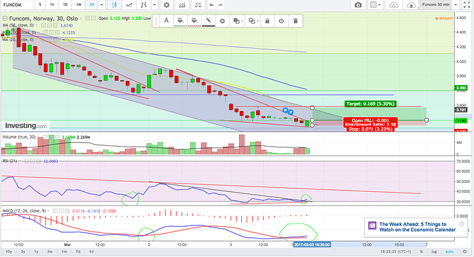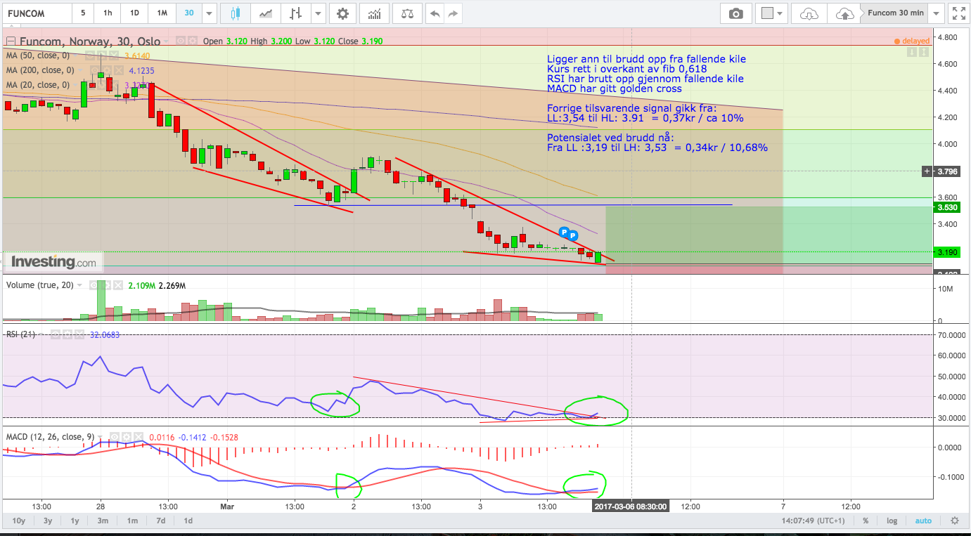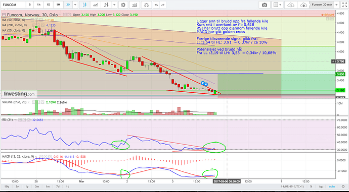 Tekniske signaler gir rom for brudd opp mot MA 50 / topp RSI trend, men er litt konservativ å setter target under MA50, da den stoppet opp før MA 50 på forrige brudd over MA20. La til trendlinjene i RSI jeg mener er utslagsgivende, for når den med størst sannsynlighet bryter ned igjen.