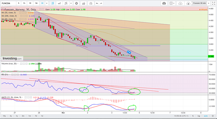 På nedsiden er det sterk støtte på 2.80-2.90. Forøvrig kunne mange unngått en del tap hvis man solgte når MACD ga dødskryss og kursen bikket under 4.00 kr. Jeg håper vi skal ned og teste bunnen slik at 2.80 blir sementert med armert betong