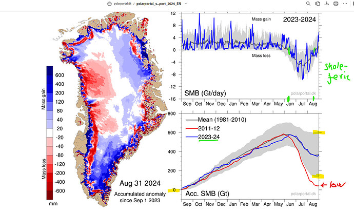 Den blå linjen er sesongen 2023-24, siden fryse-smeltesesongen på Grønlands-isen starter 1. september, og ble konkludert 1. september 2024.