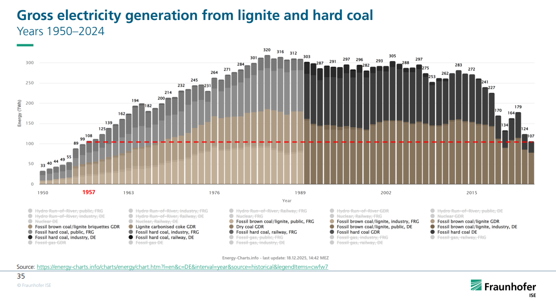 Kullproduksjonen i Tyskland gikk litt opp etter covid-dumpa + krigen i Ukraina. Ellers har det stort sett gått nedover, f.eks. fra 179 tWh i 2022 til 104 tWh i 2024, en nedgang på over 40 % mens krigen har pågått, eller f.eks. ned fra 279 tWh ti år tidligere, i 2014.