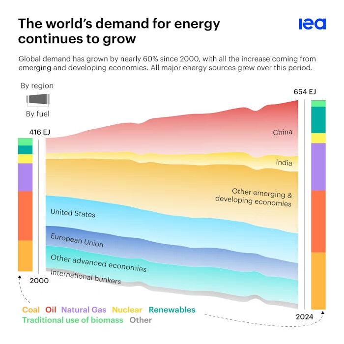 Dere som tror at kjernekraft er en quick fix kan jo forklare meg hvorfor det ikke satses mer på dette globalt. Siden 2000 har gass og fornybar økt veldig globalt, kjernekraft ganske stabilt. Det er ikke Tyskland som driver denne fornybardelen opp akkurat… Det kommer mange prosjekter innen kjernekraft nå framover, og den teknologien har mange gode sider. Men det er ikke sånn at den leverer stabil kraft døgnet rundt året rundt den heller. Planlagte og ikke minst ikke planlagte driftsavbrudd kan stelle i stand mye problemer hvis man har en forhøy andel her også, f.eks. i Finland. I 2022 måtte Frankrike stenge ned et kjernekraftverk om sommeren fordi vannet var for varmt til å kjøle ned reaktoren. Da er det greit å ha andre kilder også. Variert kosthold er bra for kroppen, som Nølands sier. Videre er det helt tullete å se på europeiske stater som enkeltinvider. Ja, Danmark har høy andel vindkraft fordi forholdene ligger til rette for det der. Norge har høy andel vannkraft fordi forholdene ligger til rette for det her. Så går disse berømte kablene mellom enkeltstatene slik at det ene landet kan dra nytte av det andre landets fortrinn og omvendt.