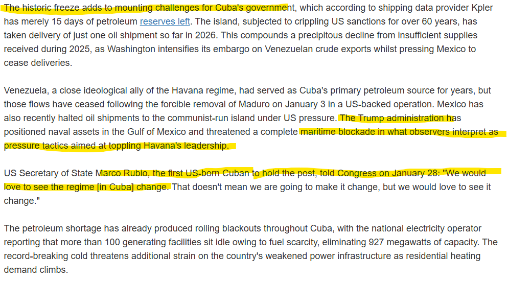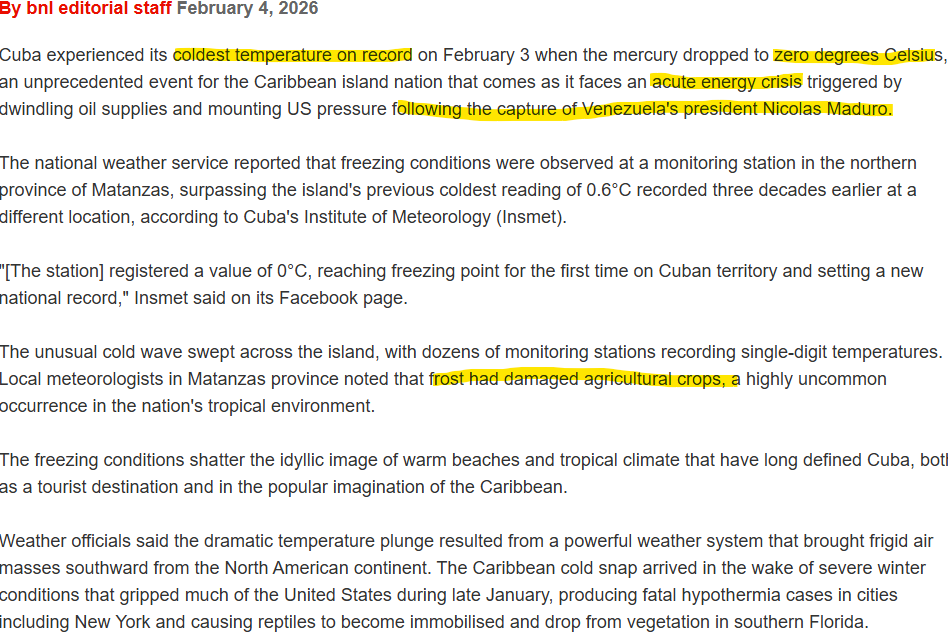Ekstremvær, dvs frost på Cuba som ødelegger avlinger og hjelper Trump s press og blokade av Cuba, burde jo være et veldig interessant eksempel på hvordan “klimaforandringer” bidrar til at de fattigste landene rammes mest.