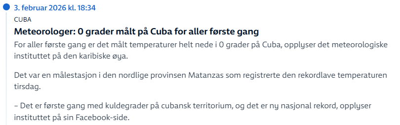 Det er ikke et scoop i det hele tatt, NRK stod på i bakgrunnen mens jeg skrev innlegget om Cubas kulderekord; første gang det er registrert 0 grader på Cuba, noe som burde vært nyheter gitt situasjonen på Cuba.