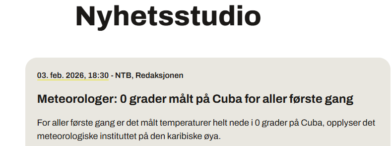 Kulderekorder på Cuba har aldri vært og kommer aldri til å bli førstesideoppslag i en norsk avis. At jeg lanserte “nyheter laget for at ingen skal få det med seg” som genial forretningside var opplagt ironisk. At du tilsynelatende genuint tror at man presenterer nyheter slik at ingen skal få det med seg sier jo litt om hvordan det står til. Hvis det utvikler seg til en humanitær katastrofe får vi nok høre med om denne kulderekorden, tipper jeg.