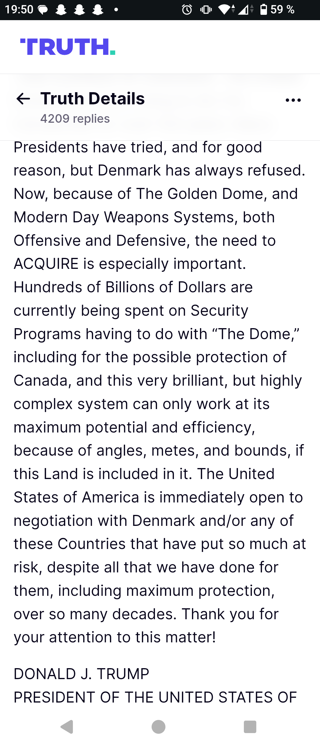 Spinndoktoren prøver å legge skylden på Danmark og øvrige allierte med å si at vi setter verden i fare samt at vi er utakknemlige som ikke gir dem Grønland etter alt USA har gjort for oss. Han spiller på frykt og nevner The Dome (forsvarssystem) som grunn til at han må eie Grønland.