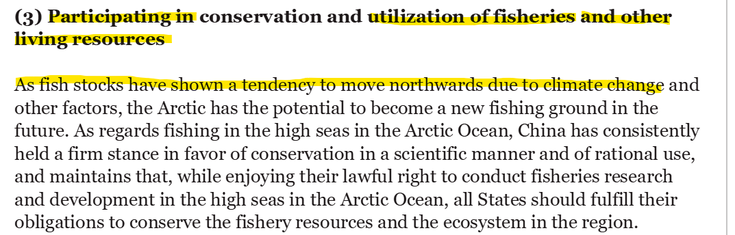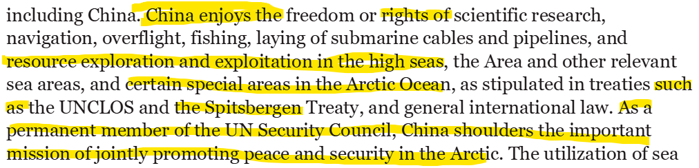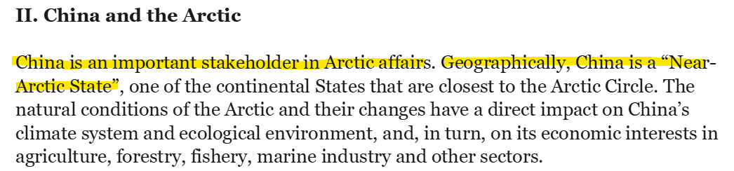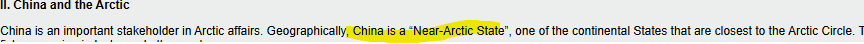 Ikke mindre så er det i dokumentet om Kinas arktiske politikk, så det er ikke bare forskning det er også politikk i Kinas rett som en “nær-arktis stat”.