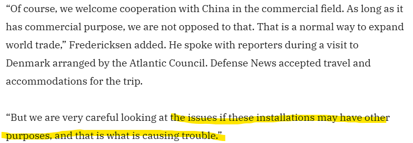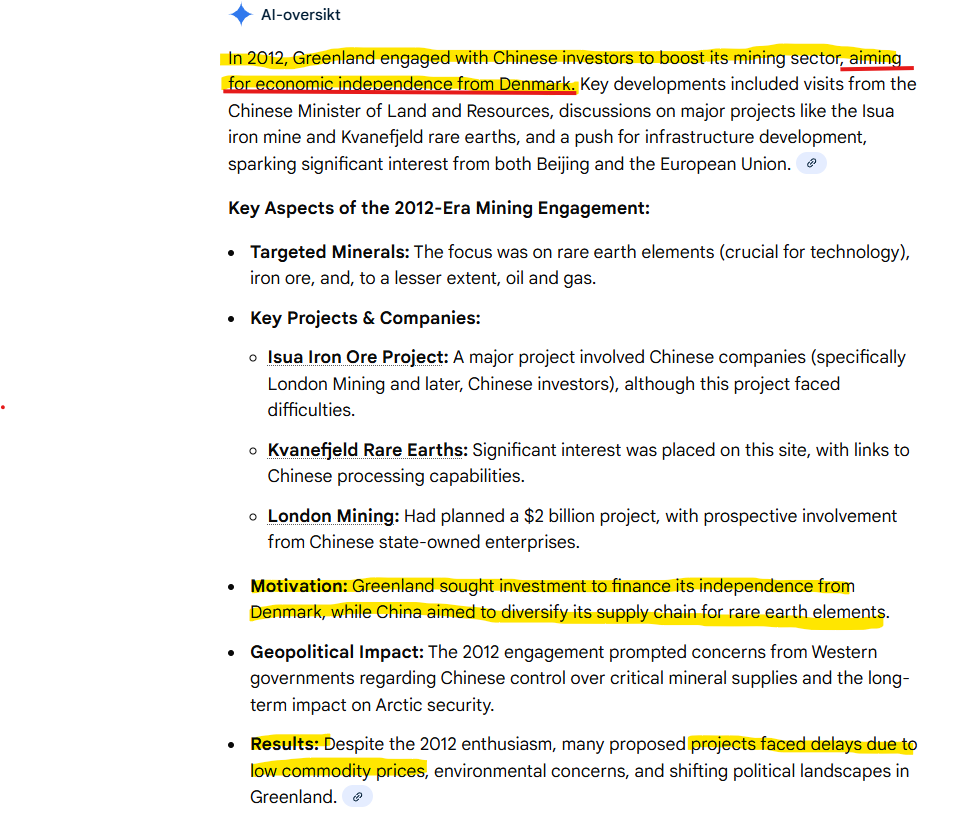 Det ble satt på hold av Danmark og USA, men jeg tenker at Kina fortsatt er interessert i å ha et solid fotavtrykk på Grønland. Og at de har god tid til å vente. 3 år til med Trump er intet in the long game.