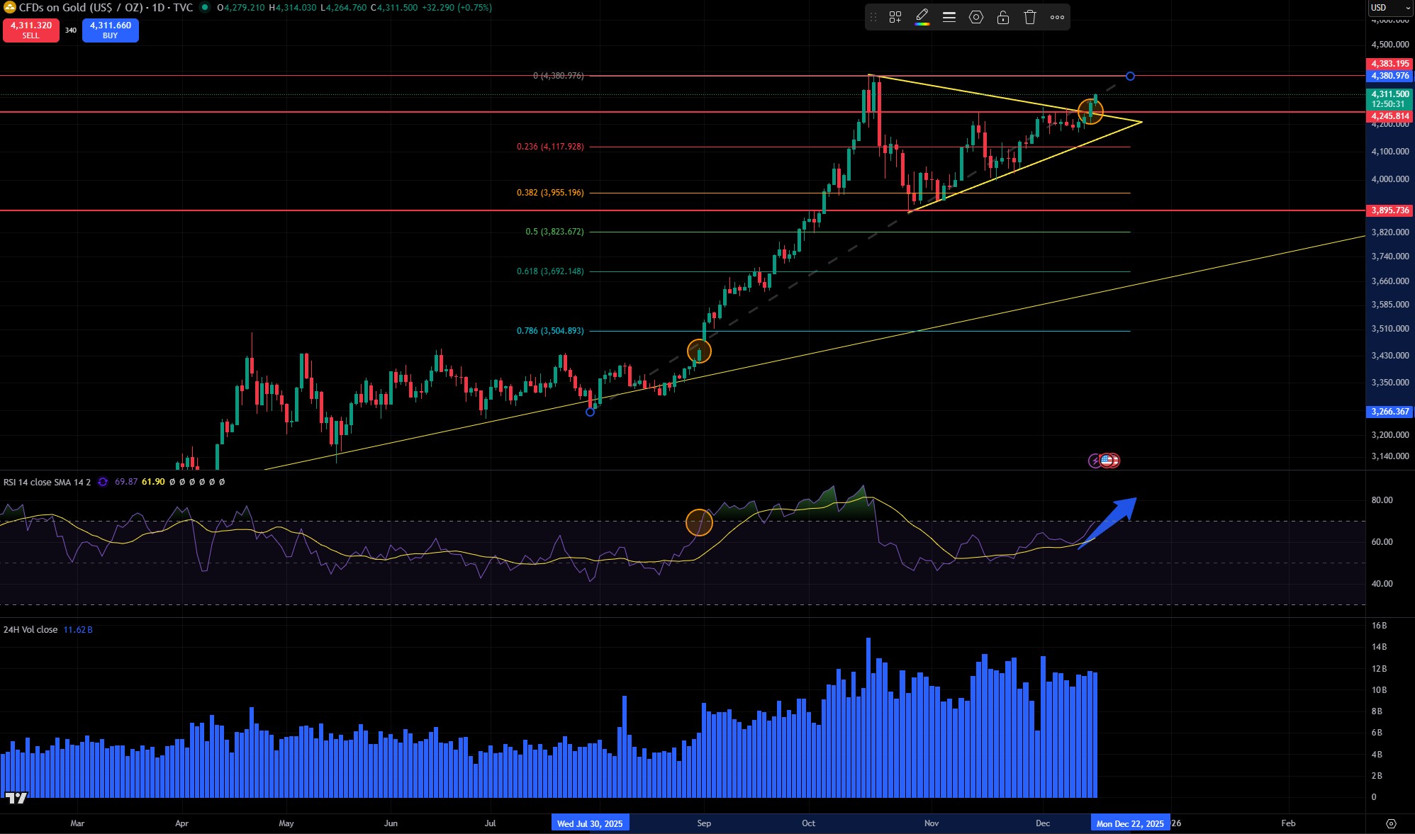 Markedet begynner å lukte en større sannsynlighet, enn nåværende 24% sannsynlighet, for rentekutt i januar. Gull stiger litt, bitcoin stiger litt og dollarindexs faller litt etter jobbtallene.