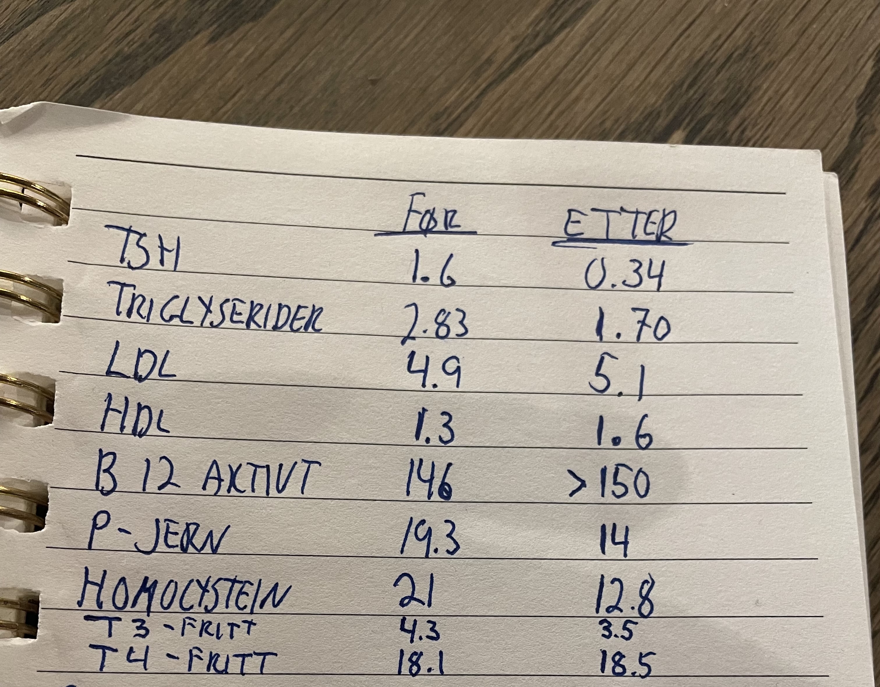 Homocystein (ikke peiling på) og LDL hadde vel positiv utvikling mens LDL, TSH og P-Jern vel er negativ. Eller hvordan tolker du det?