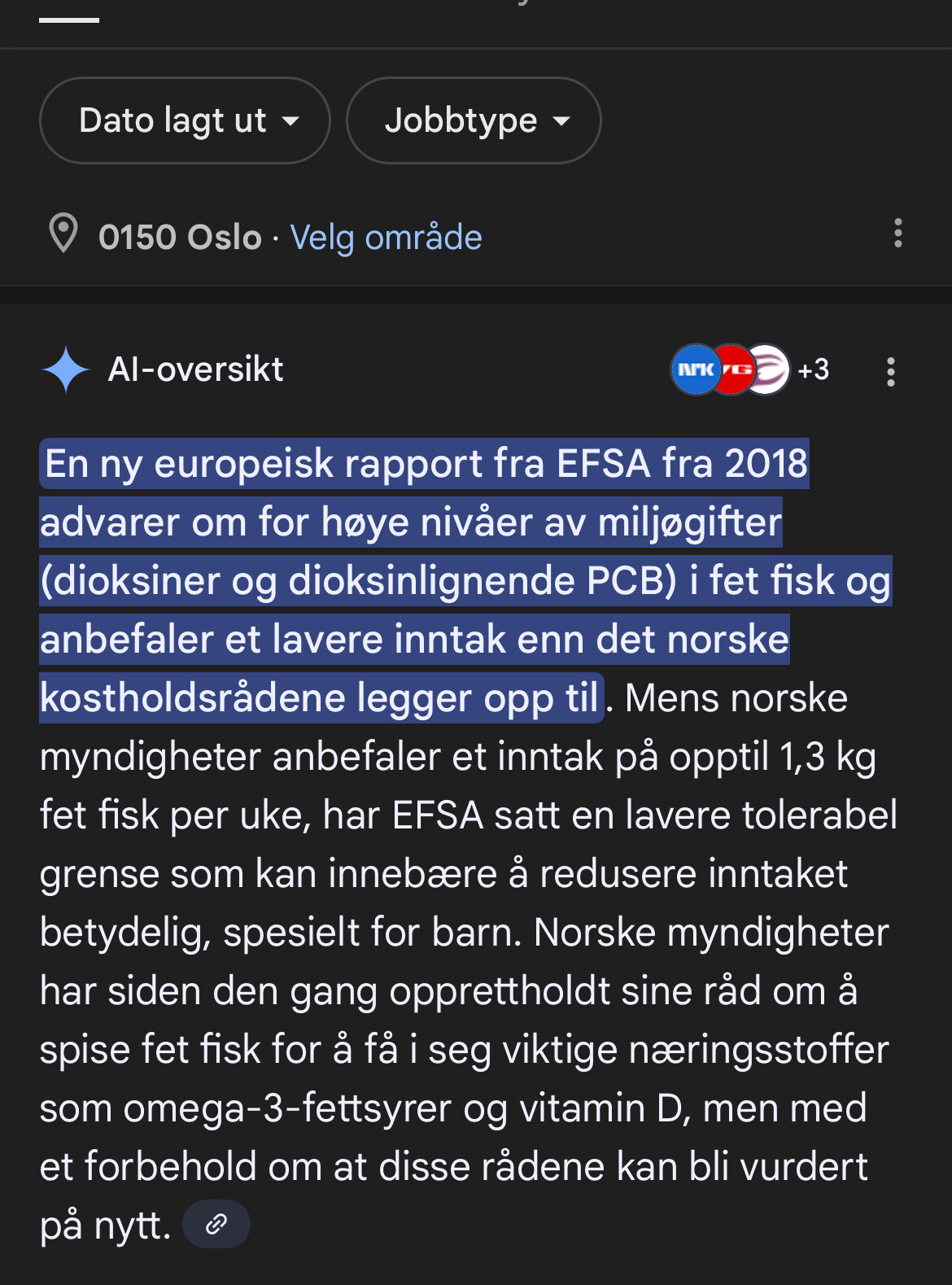 Miljøgifter er en ting man må vurdere men finnes jo i mye (dessverre) og det må vurderes opp mot gevinst. Tallene dine fra AI er helt på jordet da. Her er fra Helsedirektoratets egne sider: