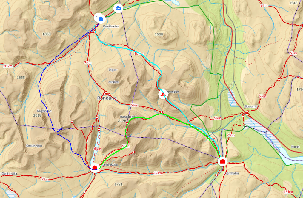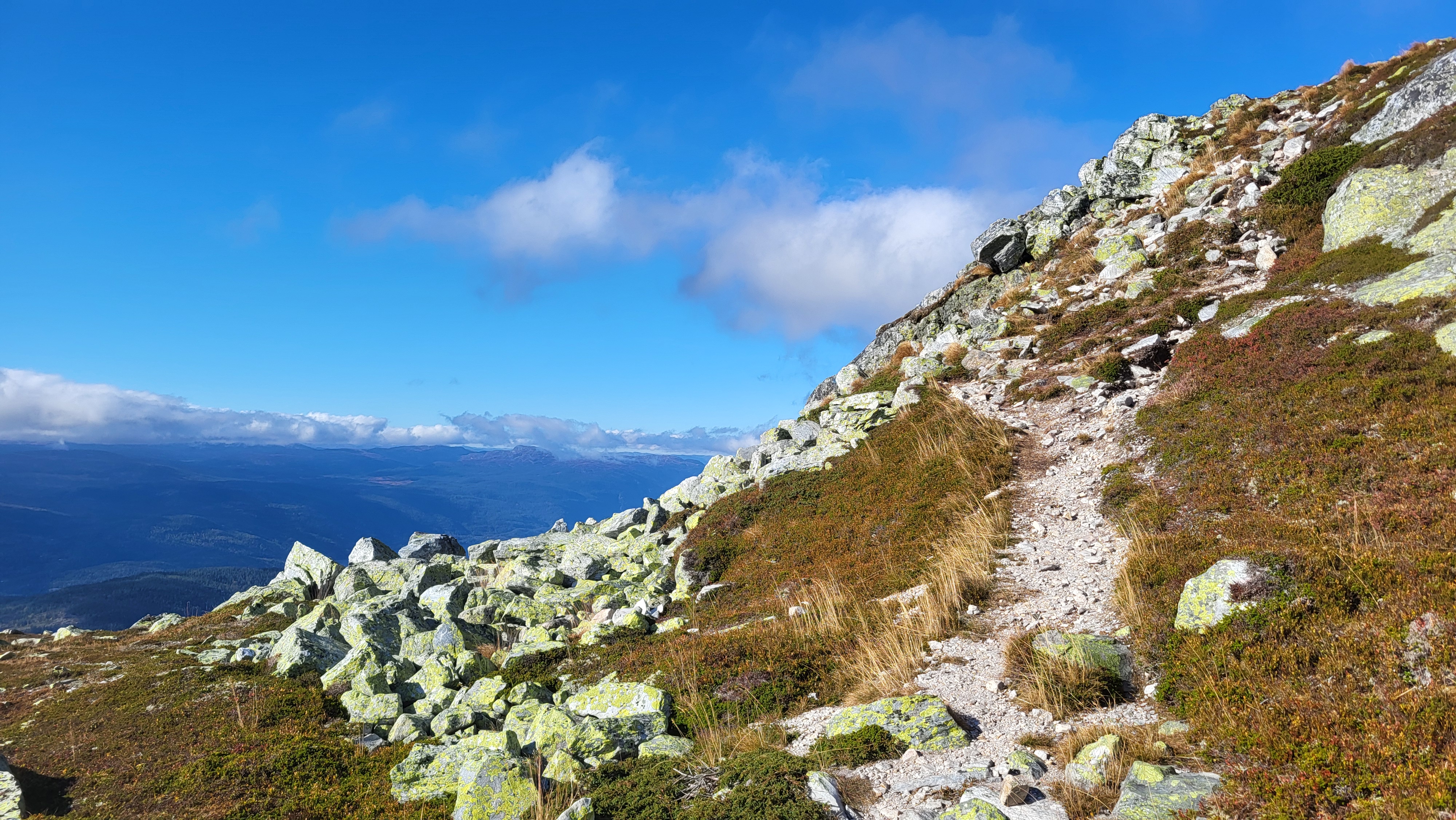 Det andre punktet var ned på nordsiden av Høgronden. Ryggen du går nedover smalner helt til og du må gå på utsiden av en stor stein. Jeg husker ikke hvor bredt det er utenfor steinen. Litt mer enn en meter. Til høyre for deg, så har du et 400m stup… Jeg er heldigvis mer høydesterk på vei nedover enn oppover, så klarte å manne meg opp til å gå forbi stedet.