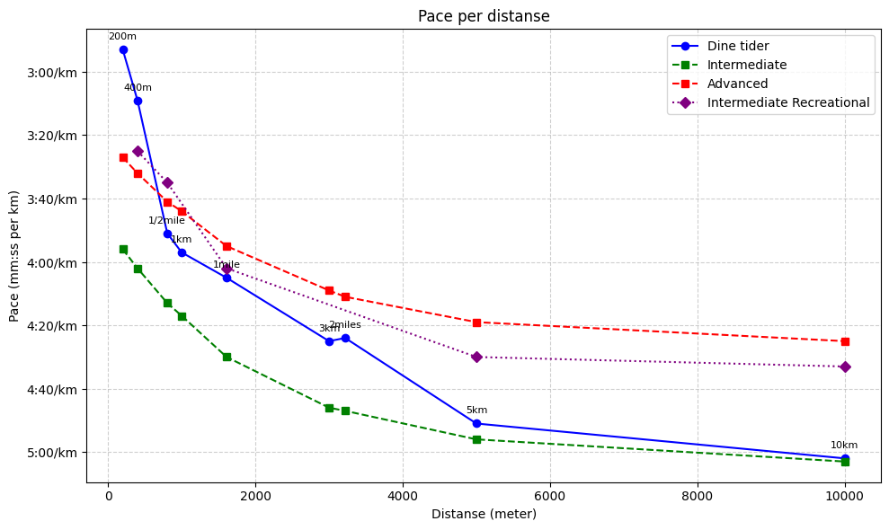 Jeg la nå inn tallene fra marathon handbook (https://marathonhandbook.com) de har noen sånn “hva er en god tid for x”, og jeg la inn for intermediate recreational 45+, tidene der virker mer realistiske på 1/2 mile osv, enn running level men fortsatt er jeg veldig overrasket over at 400m ser ut som er min beste distanse. Det matcher ikke mitt selvbilde i det hele tatt. Hadde vært moro å karre meg opp på den lilla linjen på ca et års sikt på de andre distansene.