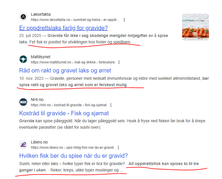 Kjapt eksempel. Søker man på google om laks, gravide og små barn får man opp dette: