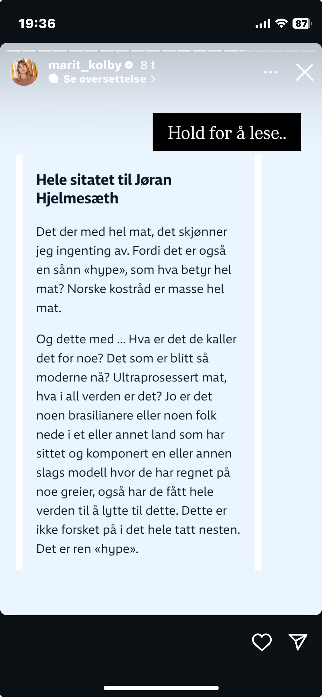 Vitner dette om en person som er objektiv og åpen for hva forskningen sier? For meg viser det en person som legger alt for mye av egoet sitt i sine meninger og går alt for hardt ut til å noen gang kunne endre mening. Han er alt for personlig- og følelsesmessig investert i temaer. Basert på sånne uttalelser sitter jeg igjen med inntrykket at uansett om de vet at de tar feil, handler det om eget omdømme, ikke folks beste. I beste fall vil de endre mening over så lang tid at man vil aldri kunne ta dem på at de har byttet side. Dessverre er det sånne folk som er med å bestemme hvordan vi bør spise.
