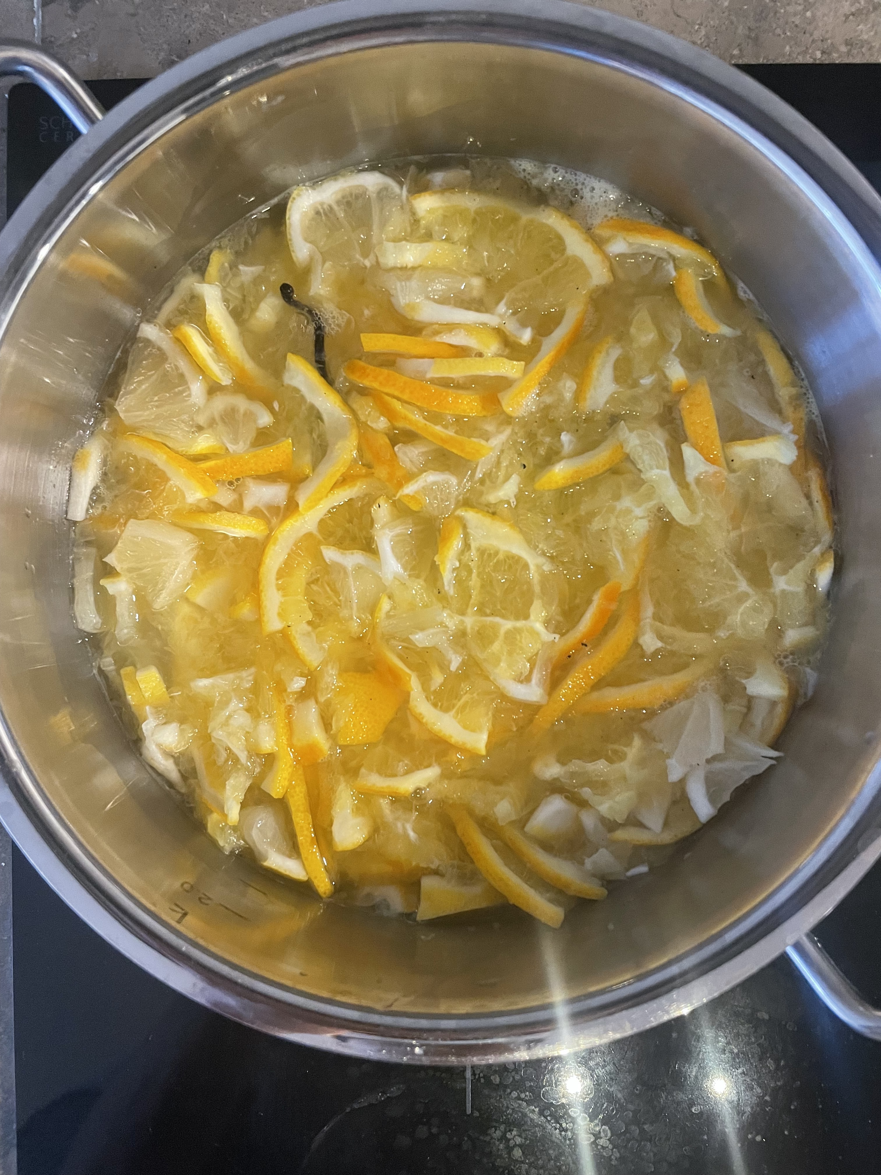 Ellers er det appelsinmarmelade på gang her, denne skal nå småkoke i minst to timer (så klart økologiske appelsiner og sitroner)