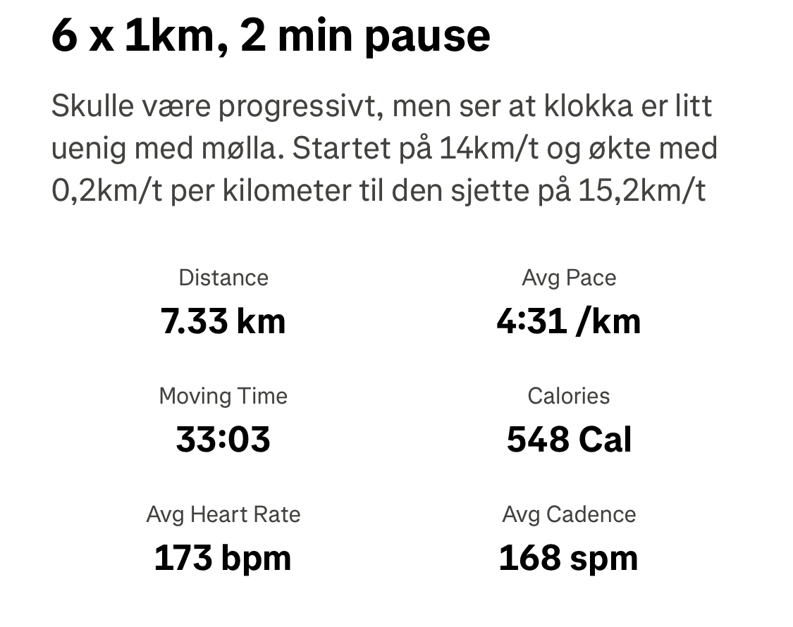 Jeg følte jeg fikk veldig stort utbytte av intervalltrening, men motivasjonen for det pleier å treffe med når jeg blir forkjølet på høsten, så har aldri fått satt det skikkelig i system.