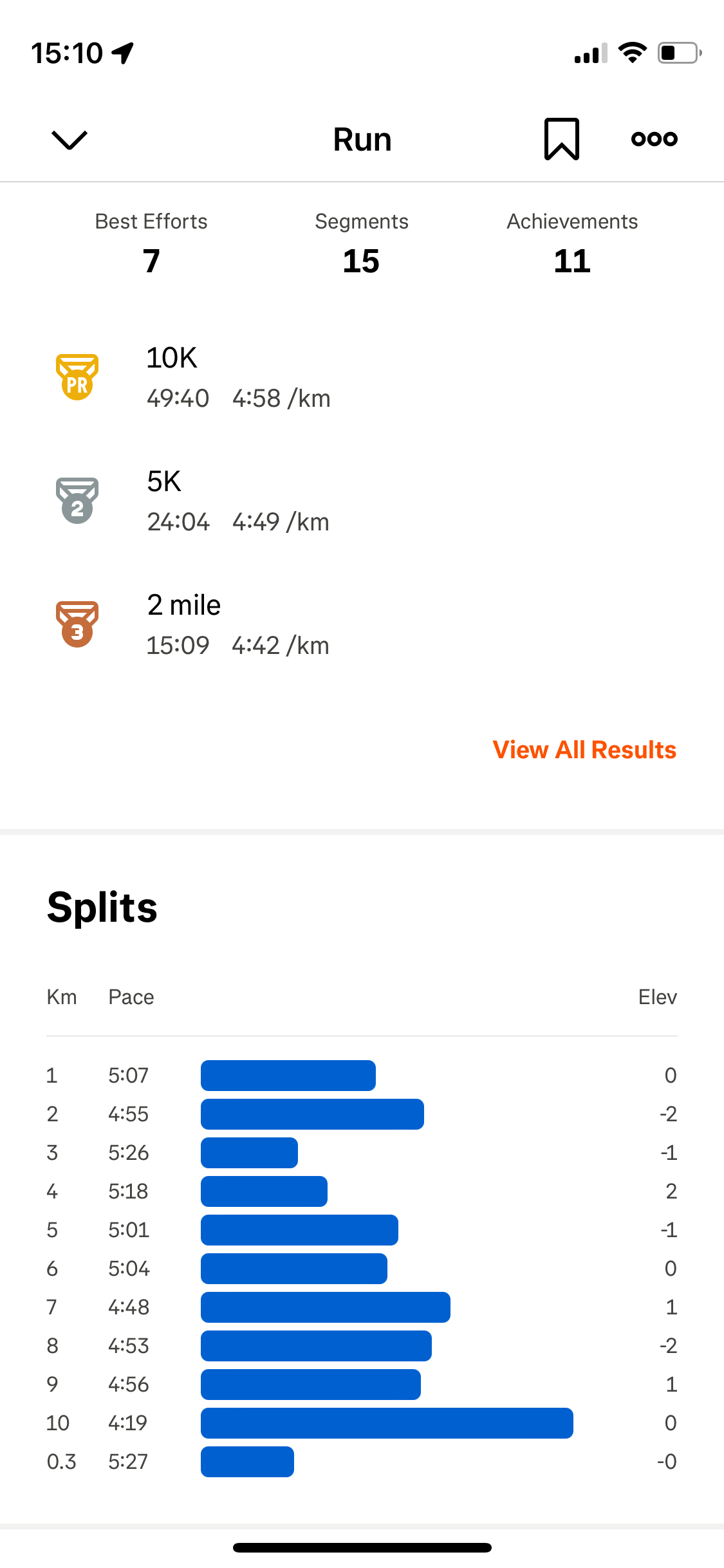 Ny pr igjen uten at det var meningen fra start. Viser at strategien med høyere volum fungerer. Tidligere pr 10k 50:18 5:02/km så ikke allverdens forbedring 49:40 og 4:58/km men psykologisk litt morsomt under 50 minutter. Tidligere pr var på løpebane så med tanke på det er jeg fornøyd.