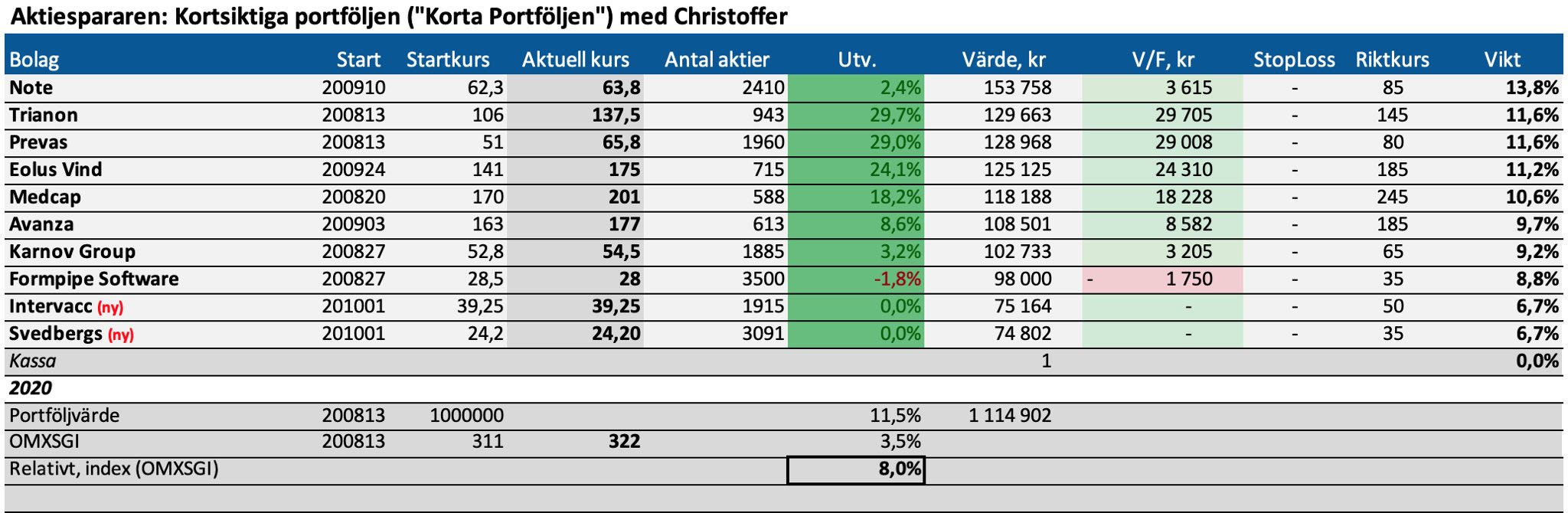 För Korta Portföljens del plockas aktien plockas in med en vikt på cirka 7,5 procent. Inköpet görs till kurs 39,25 kronor. Riktkurs sätts till 50 kronor med en placeringshorisont på 3 månader.