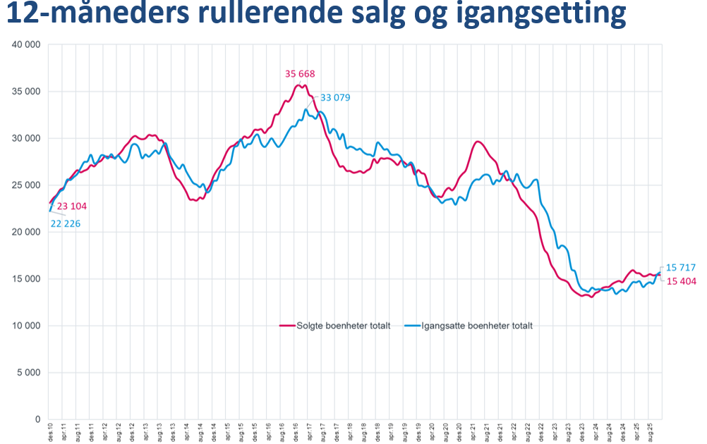 Totalt antall igangsatte nye boliger i siste tolvmånedersperiode er 15 717 boenheter, som er 15 prosent over forrige tolvmånedersperiode, og 43 prosent under beregnet boligbehov[1].