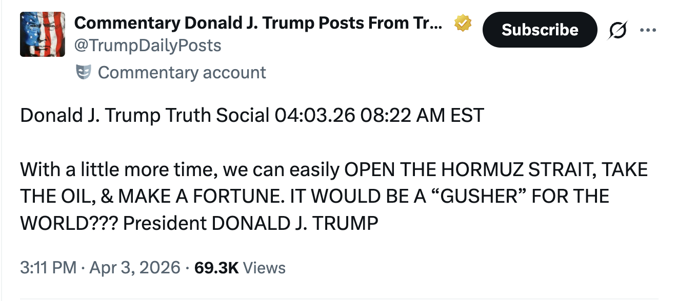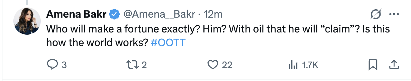 Siste nytt fra trumpeten. Nå handler alt om olje og penger. Trenger bare litt mer tid. Ser vi boots on the ground før mandag?