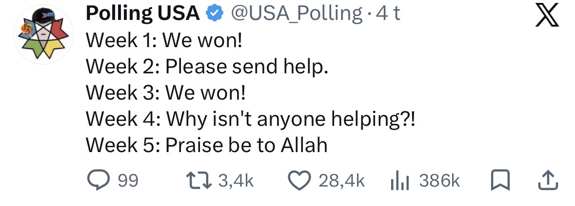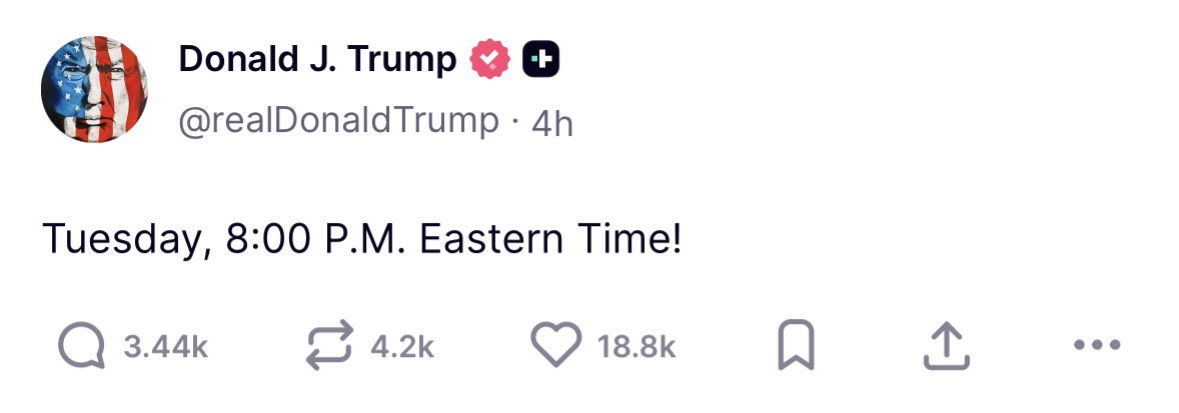 Er sjette gang Trump nå kommer med en tidsfrist. Sikkert «art of the deal» opplegg dette, men begynner å bli litt latterlig.