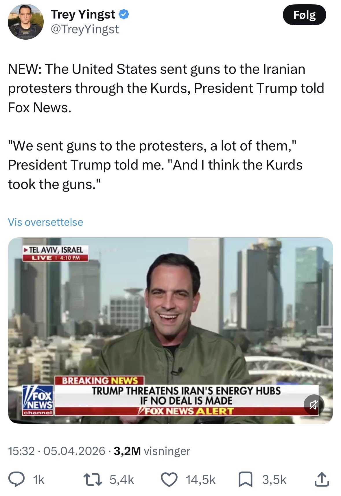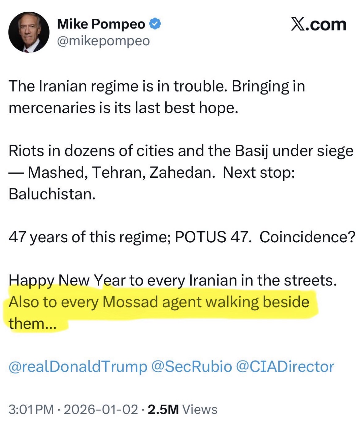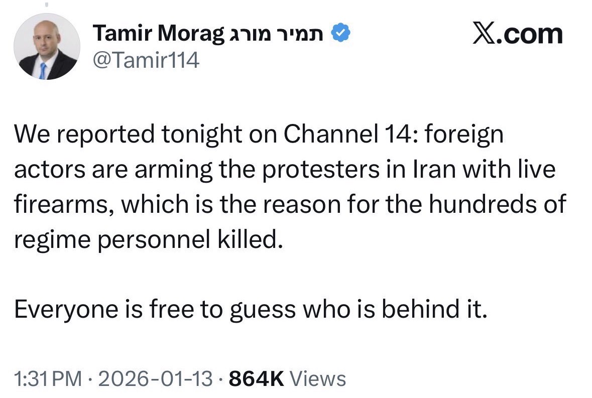 Israel/Mossad som hadde video på hvert eneste trafikklys i Tehran, var slik de visste hvor ayatollah til enhver tid befant seg, har ikke delt noen film av disse 20-60.000 døde. Det du derimot har er Mike Pompeo som selv tweetet at Mossad var ute blant terroristene, du har Israels nyheter som bekrefter dette og du har Trump som på Fox News i dag sa at han gav våpen til kurdere i forbindelse med demonstrasjonene.
