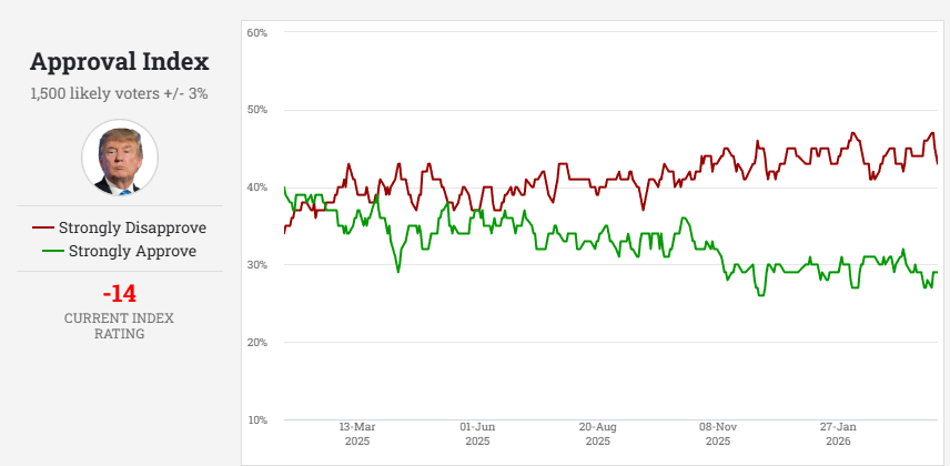 Sist måling, 03 april 2026 var Trump på -14, mens Biden lå på -20 til -28 i måneden frem til Trump-Biden debatten i slutt juni 2024 hvor selv den mest i huga Biden tilhengeren måtte innse den mentale tilstanden.