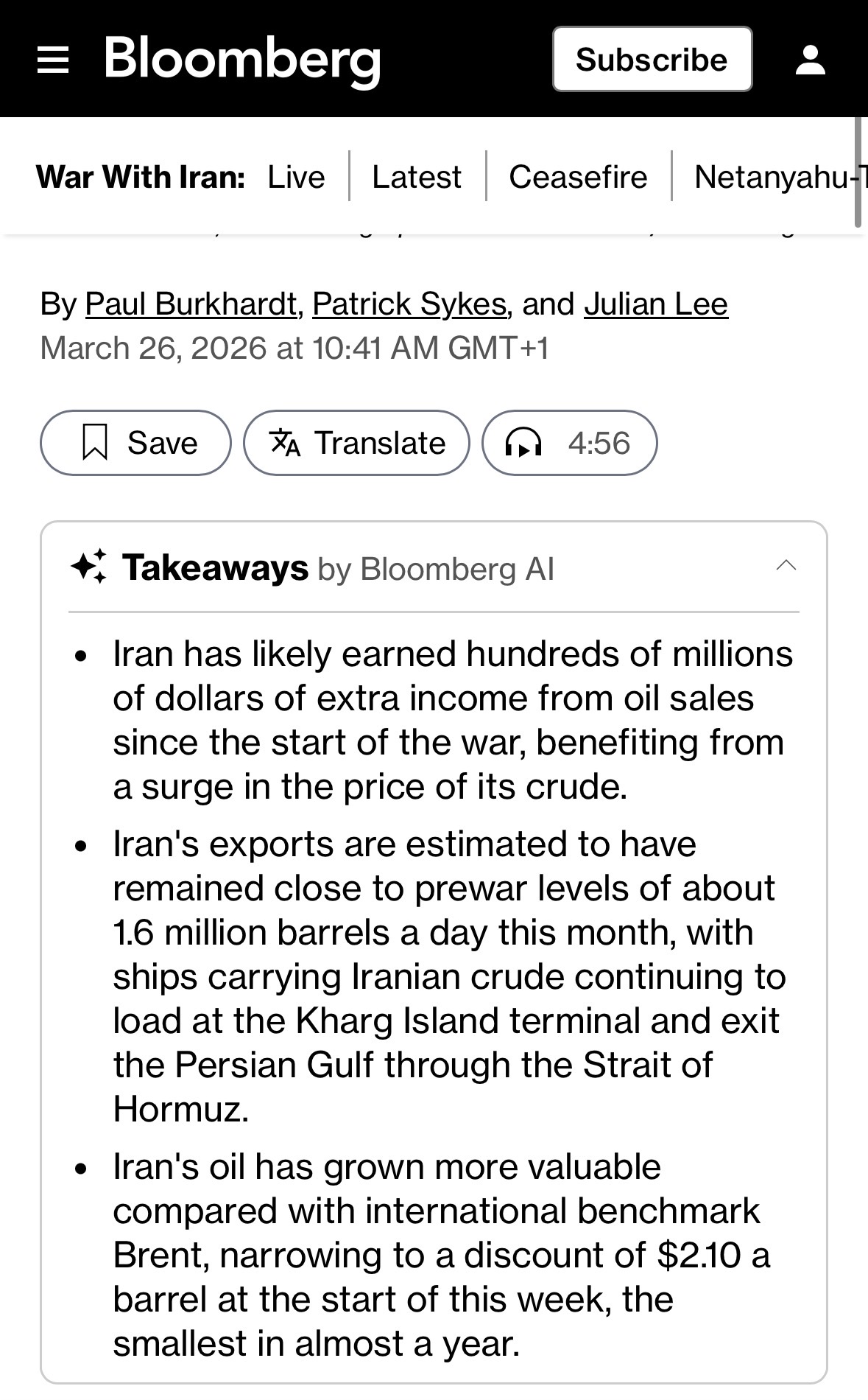 Det som ikke blir snakket om her er at samtidig som denne oljen blir kinetisk sanksjonert av Iran, så gjør Ukraina det samme med russisk olje. Tror det er snakk om 2-3m bpd der som er satt ut av spill. Sammenlignet med ca 7,5 - 10m bpd fra Iran sin blokkade.