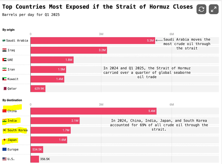 Så, spørsmålet er jo om USA har ønsket/viljen til å stå i høye oljepriser i type 2-4 måneder før oljetransporten kan gjenopptas? Som jeg har nevnt endel ganger, det er først og fremst Asia med Kina, India, Sør-Korea og Japan. Europa og USA importerer en mindre mengde som det neppe er særlig farlig med. Kina kan jo begynne å prøve å kjøpe olje fra andre steder, men jeg tenker jo at f.eks. Equinor ikke vil bytte ut de typiske kjøperne sine med kinesisk her. Prisene vil dog øke vesentlig.