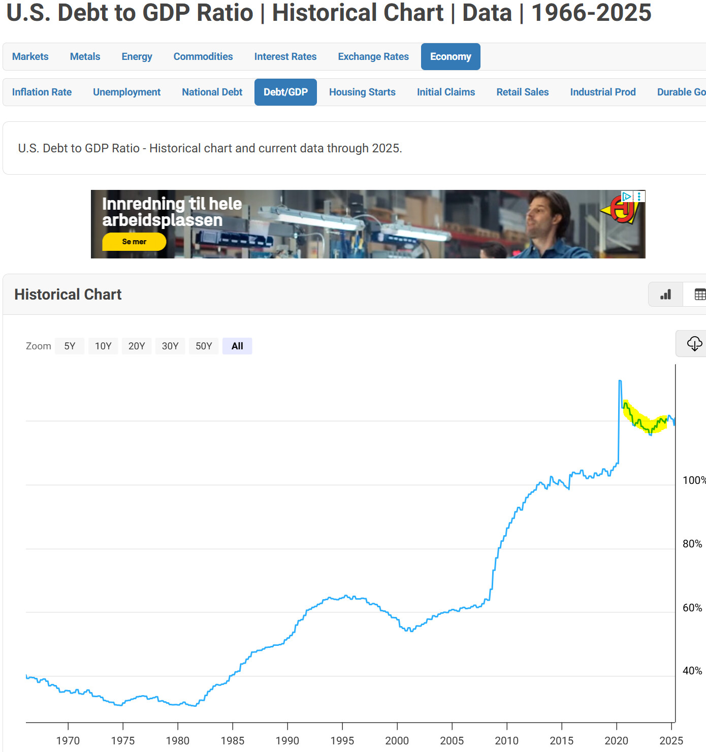 I 2020, under Trump, så gikk gjelden fra ca 100% til 120% av gdp i Covid-tida.