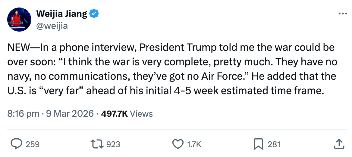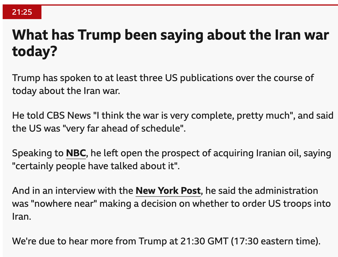 On the progress of the war : “I think the war is very complete, pretty much. They have no navy, no communications, they’ve got no air force. Their missiles are down to a scatter. Their drones are being blown up all over the place, including their manufacturing of drones. If you look, they have nothing left. There’s nothing left in a military sense.”