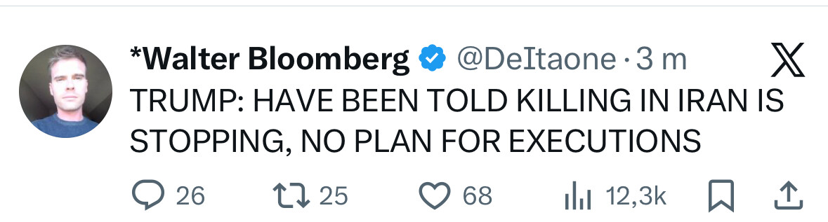 “President Trump - Thank you for picking the people over the Ayatollah, you are the first one to do that. Thank you for acknowledging that the only way you can make Iran great again is for the protesters to win over the regime, and I believe that day is at hand. And to the american people; this matters to us. This is the largest state sponsor of terrorism on the planet, they have american blood on their hands and the people protesting in the streests could be our best friends - God bless them”