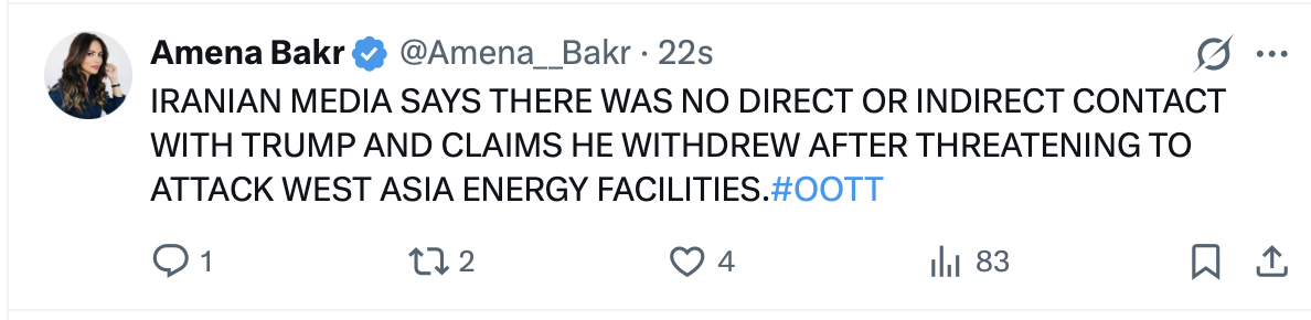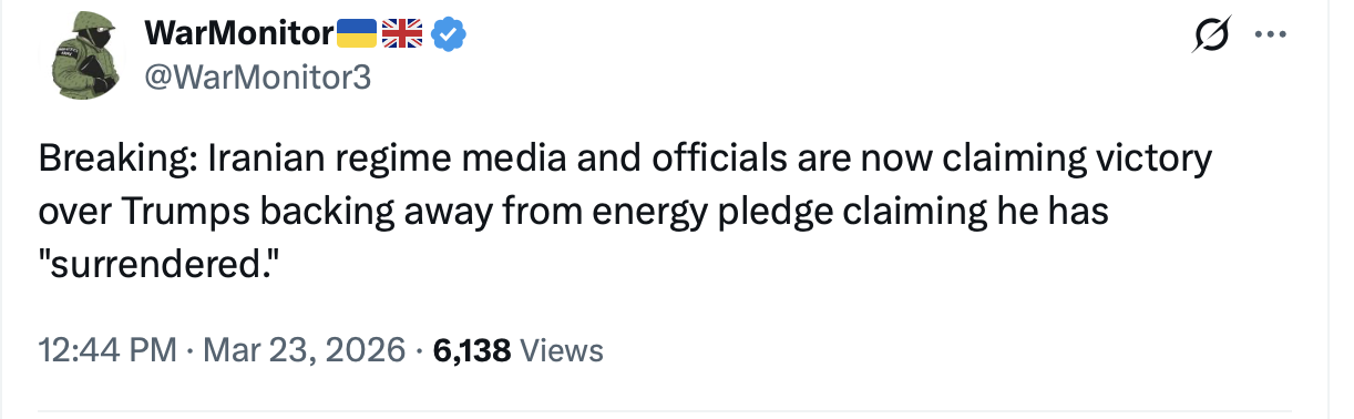 BASED ON THE TENOR AND TONE OF THESE IN DEPTH, DETAILED, AND CONSTRUCTIVE CONVERSATIONS, WITCH WILL CONTINUE THROUGHOUT THE WEEK, I HAVE INSTRUCTED THE DEPARTMENT OF WAR TO POSTPONE ANY AND ALL MILITARY STRIKES AGAINST IRANIAN POWER PLANTS AND ENERGY INFRASTRUCTURE FOR A FIVE DAY PERIOD, SUBJECT TO THE SUCCESS OF THE ONGOING MEETINGS AND DISCUSSIONS. THANK YOU FOR YOUR ATTENTION TO THIS MATTER! PRESIDENT DONALD J. TRUMP"