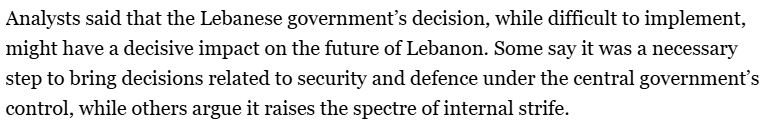 Libanons egen hær kan ikke måle seg mot Hezbollah og deres samfunnsengasjementet er avgjørende for å holde Libanon gående (skole, sykehus, sosiale tjenester).