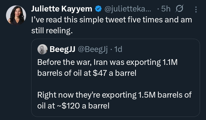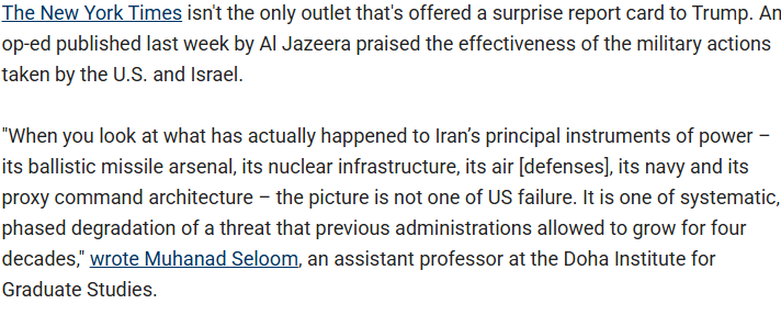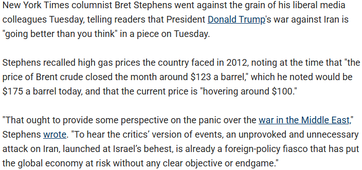 Alle disse ryktene som svirrer i media og og såkalte lekkasjene som kommer om at "Trump gjorde det, Israel styrte det, Usa snakker med den og den, “taco” ditt og datt, det var en miskalkulering av Hormuz etc etc, synes jeg det ikke er verdt å bruke mye energi på egentlig. Mye av det er rykter presentert som nyheter i diverse aviser med en agenda, mye er synsing (som jo er lov), mye er forskuttert sinne basert på opplysninger som viser seg å ikke være korrekte eller bruddstykker av helheten, mye av det er “horn i siden til Trump-journalister” som vinkler alt inn for å bekrefte bildet de har av han. Man kan si mye om han, men det meste av disse karakteristikkene er egentlig totalt uinteressant ift Iran-krigen.