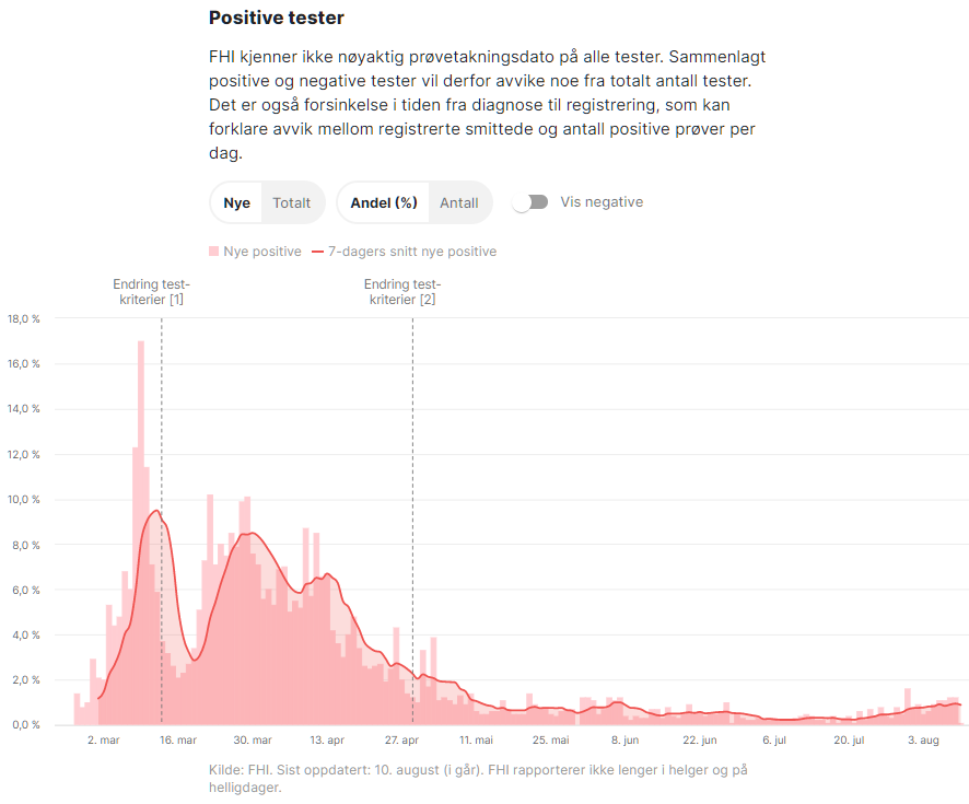 Har du noe info på hvor stor andel av testene som er positive? Testkapasiteten er vel blitt svært mye bedre og testkriteriene ikkje så strenge.