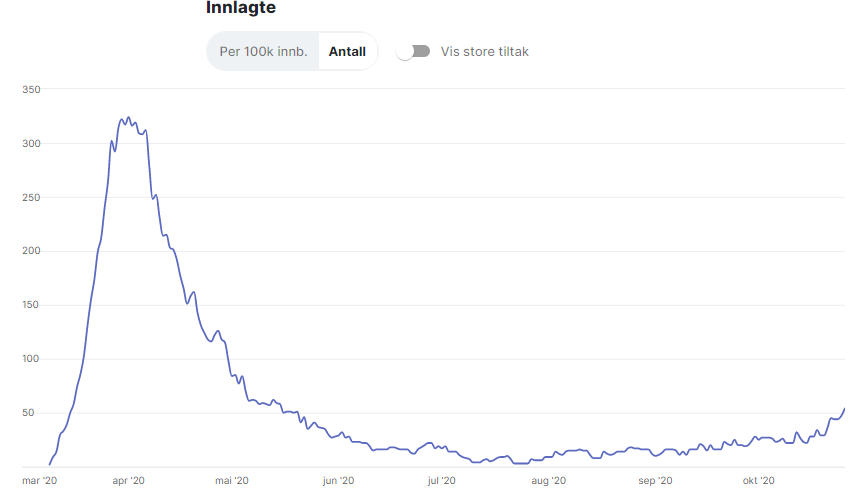 Utviklingen i innleggelser begynner faktisk å ha en litt urovekkende utvikling selv om den fortsatt er på et ganske moderat nivå.