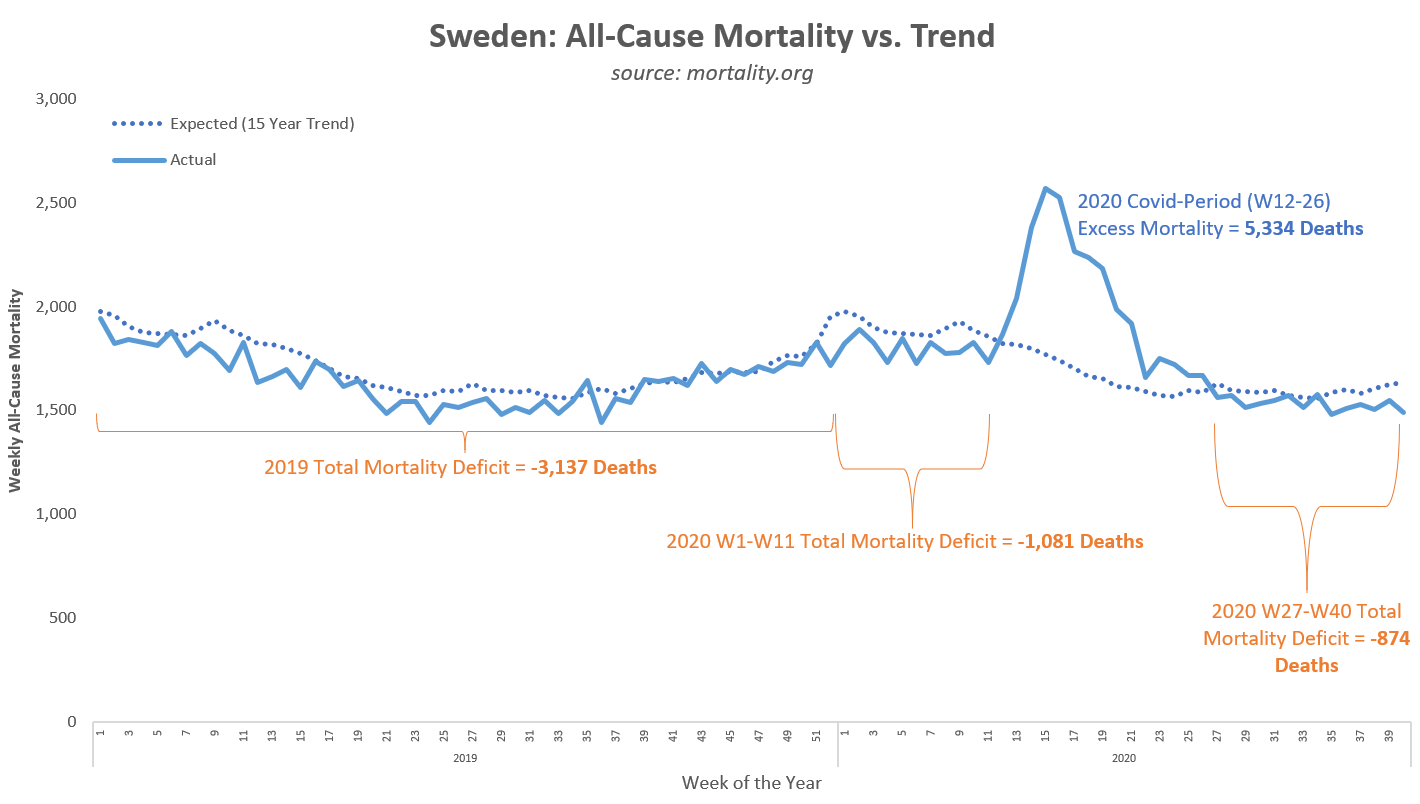 Mortality in Sweden has remained below trend for 14 weeks. Including the 2019 through early 2020 mortality deficit, total deaths are now just 242 persons higher than expected and should fall to zero total excess in the coming weeks.