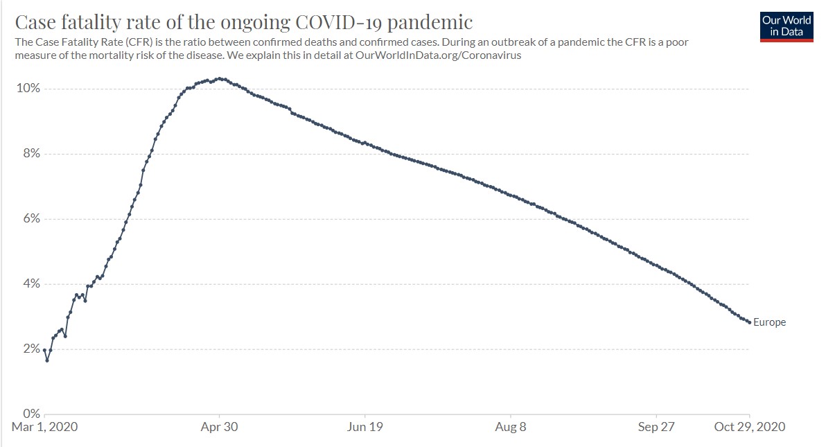 Samtidig har man en CFR (case fatality rate) som bare har vært synkende siden utbruddet startet.