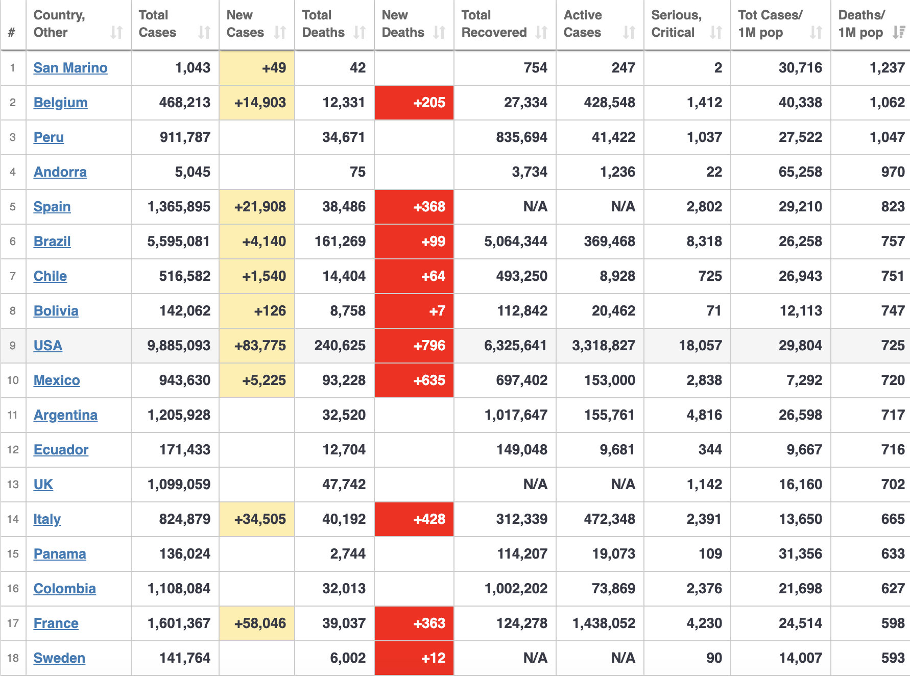 Sverige dumper stadig nedover denne listen som viser antall døde per 1M innbyggere, samtidig vet vi at Sverige er et av de landene som er flinkest til å fange opp døde (av eller med covid).