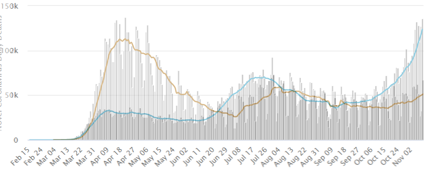 I starten var det jo veldig lite testing og derfor helt ville dødstall i forhold til registrerte smittede men man ser at grafene fra i sommer fortsatt følger hverandre ganske mye. Får jo håpe dødstallene ikke følger smittetallene like bra de neste ukene.