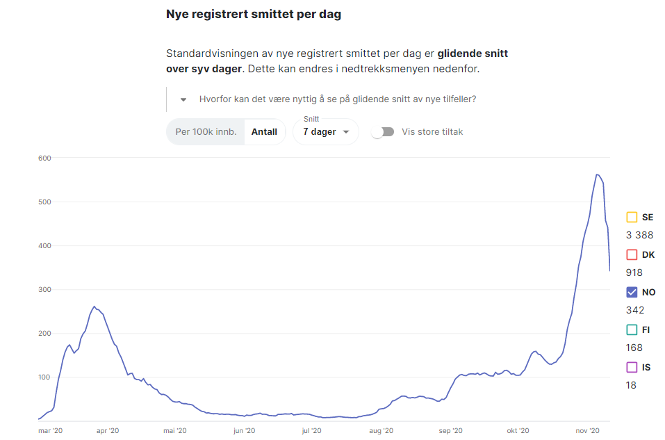 Nå ser det vel heldigvis ut som dagens tiltak gjør at smittetrenden flater ut/snur i Norge. Vi får håpe det holder seg slik.