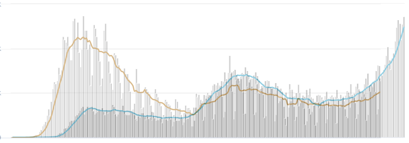Tok en liten titt på hvordan antall nye smittede og døde utvikler seg i USA. La grafene oppå hverandre og da ser de slik ut (OBS! helt forskjellig skala selvsagt).