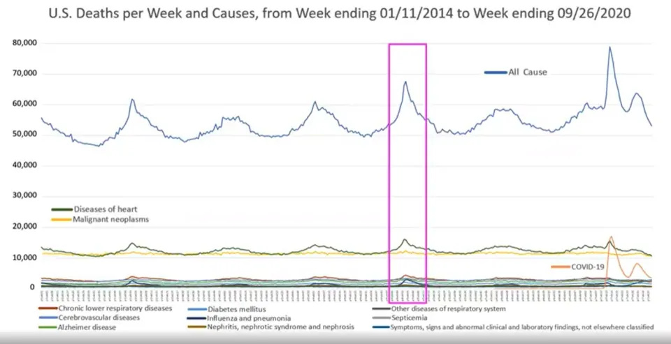 “Det lilla innrammingen er fra 2018 hvor man ser sesongtoppen av alle dødsårsaker og de enkelte dødsårsakene som også har sine små topper. Til høyre er 2020 hvor man for det første ser at covid har oversteget hjertesykdom, og at hjertesykdom har en nedgang, og det samme har alle de andre spesifikke sykdommer.”