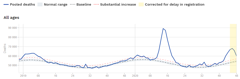 Kapasiteten har kanskje fått seg en større utfordring enn normalt - men det har altså ikke vært en overdødelighet i USA - dette iflg. John Hopkins-universitetet. Det vil si, det har ikke dødd flere mennesker i USA i år enn det normalt gjør, heller ikke blant eldre.