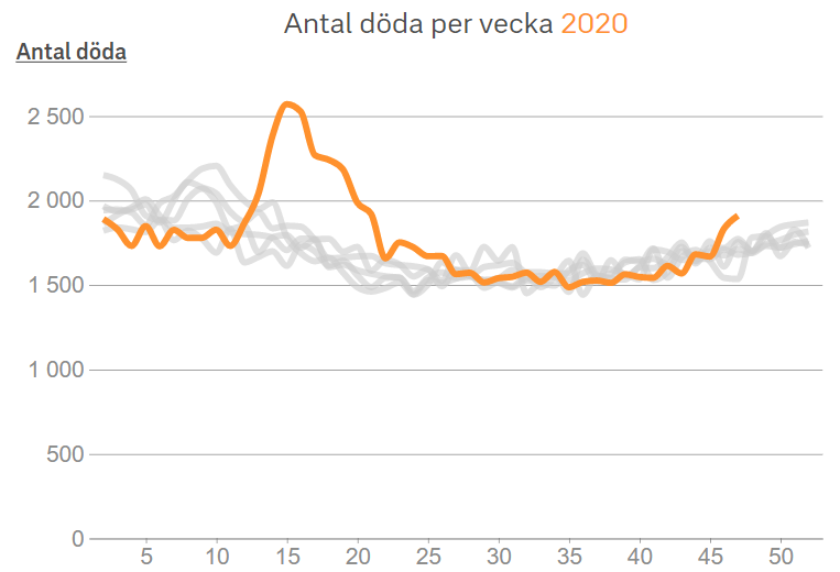 Når det gjelder dødeligheten i Sverige så har den også steget en del i det siste. De grå er de foregående årene.