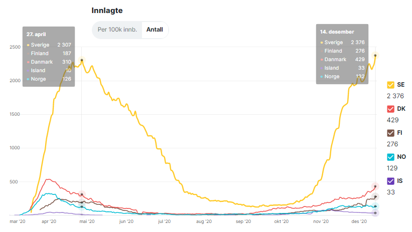 Men at Norge har gjort mye riktig, er det vel liten tvil om. Sammenlignet med vårt naboland Sverige, har vi 7,3 døde pr 100K innbyggere, mens Sverige har 74,4 !